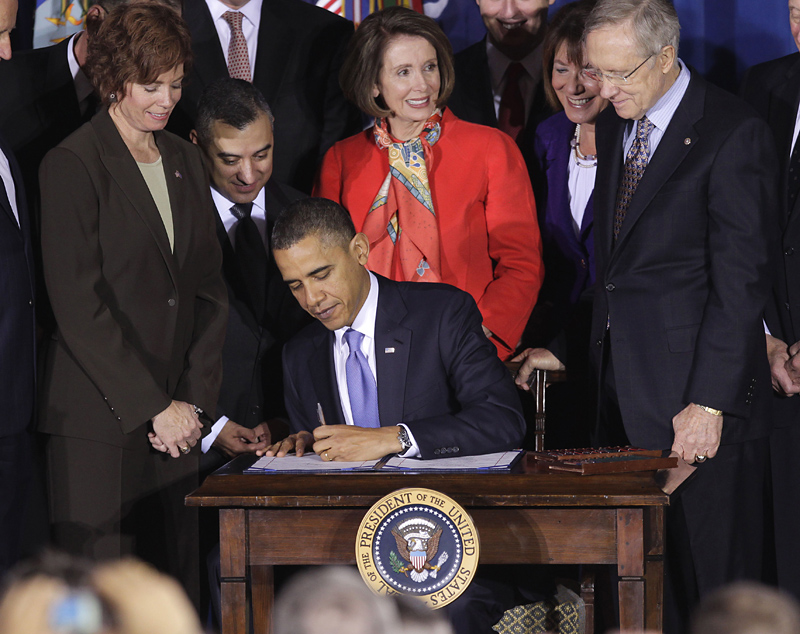 President Barack Obama signs the Don’t Ask, Don’t Tell Repeal Act of 2010, Wednesday, Dec. 22, 2010, during a ceremony at the Interior Department in Washington. House Speaker Nancy Pelosi of Calif. is at center, Senate Majority Leader Harry Reid of Nev. is at right. (AP Photo/Pablo Martinez Monsivais)